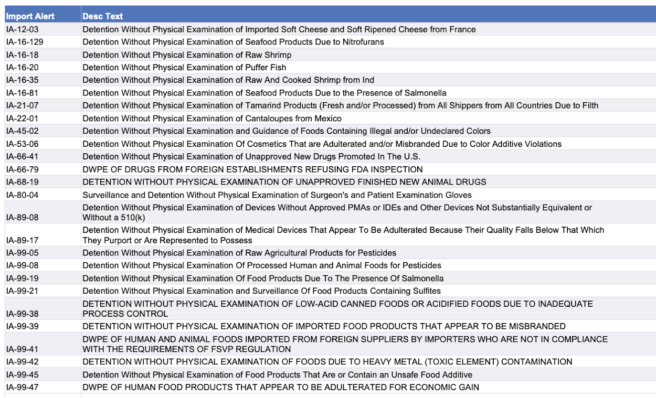 Recent modifications to FDA’s import alerts, as posted by the agency, are listed below.